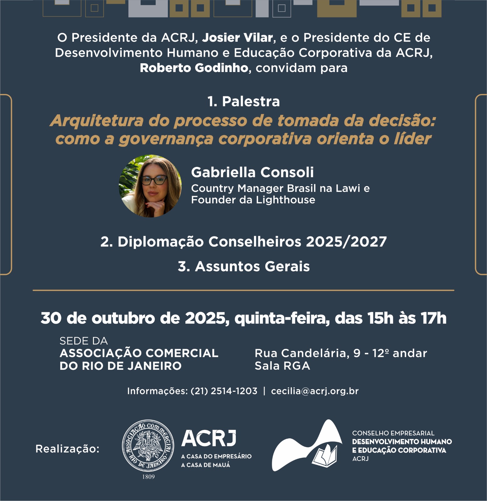 O Conselho Empresarial de Desenvolvimento Humano e Educação Corporativa da ACRJ convida para a palestra sobre tomada de decisão e governança corporativa com a especialista Gabriella Consoli, dia 30 de outubro, às 15h.