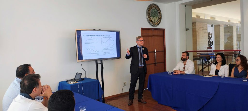 Fábio Bentes fez uma apresentação onde traçou um panorama da conjuntura econômica nacional e do Rio de Janeiro, destacando diversos aspectos da economia, como inflação, juros e mercado de trabalho, que em sua avaliação está em recuperação moderada.