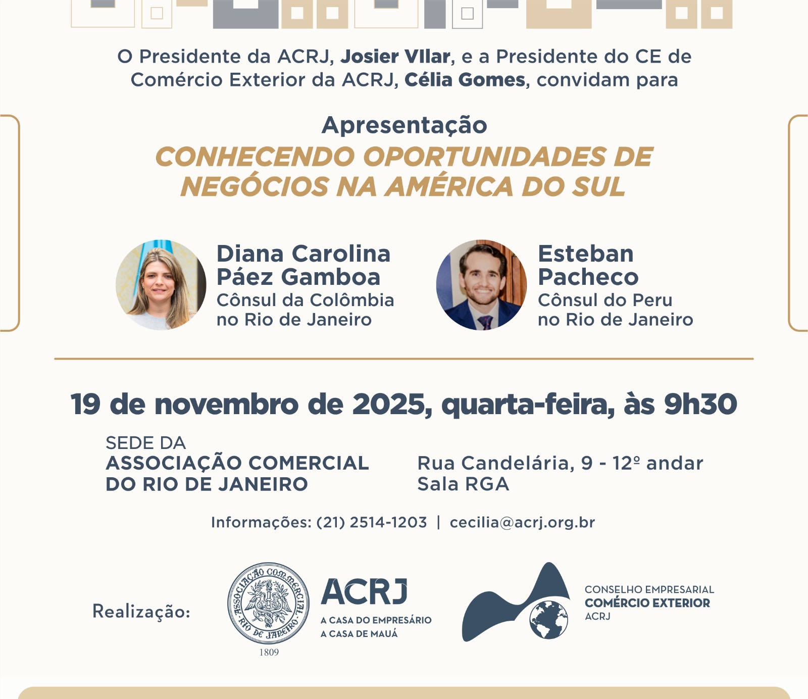 A ACRJ promove, dia 19 de novembro, às 9h30, uma apresentação sobre as oportunidades de negócios na América do Sul, com a participação dos cônsules no Rio de Janeiro, Diana Gamboa, da Colômbia, e Esteban Pacheco, do Peru.