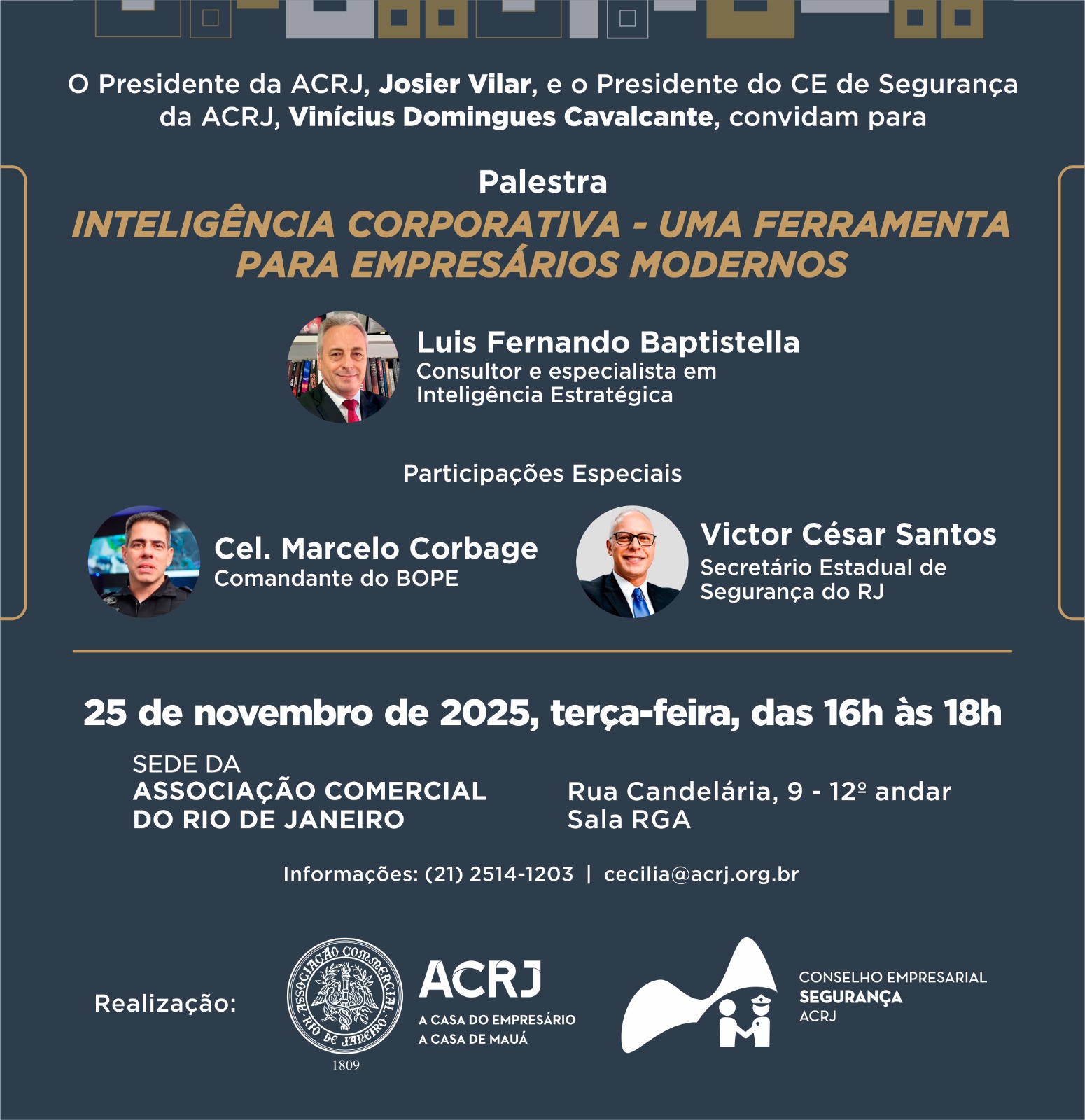 O Conselho Empresarial de Segurança da ACRJ recebe, dia 25 de novembro, o secretário Estadual de Segurança, Victor César dos Santos, o comandante do Bope, Cel Marcelo Corbage e o consultor em Inteligência Estratégica, Luiz Fernando Baptistella, para debater a Inteligência Corporativa como ferramenta para os empresários.