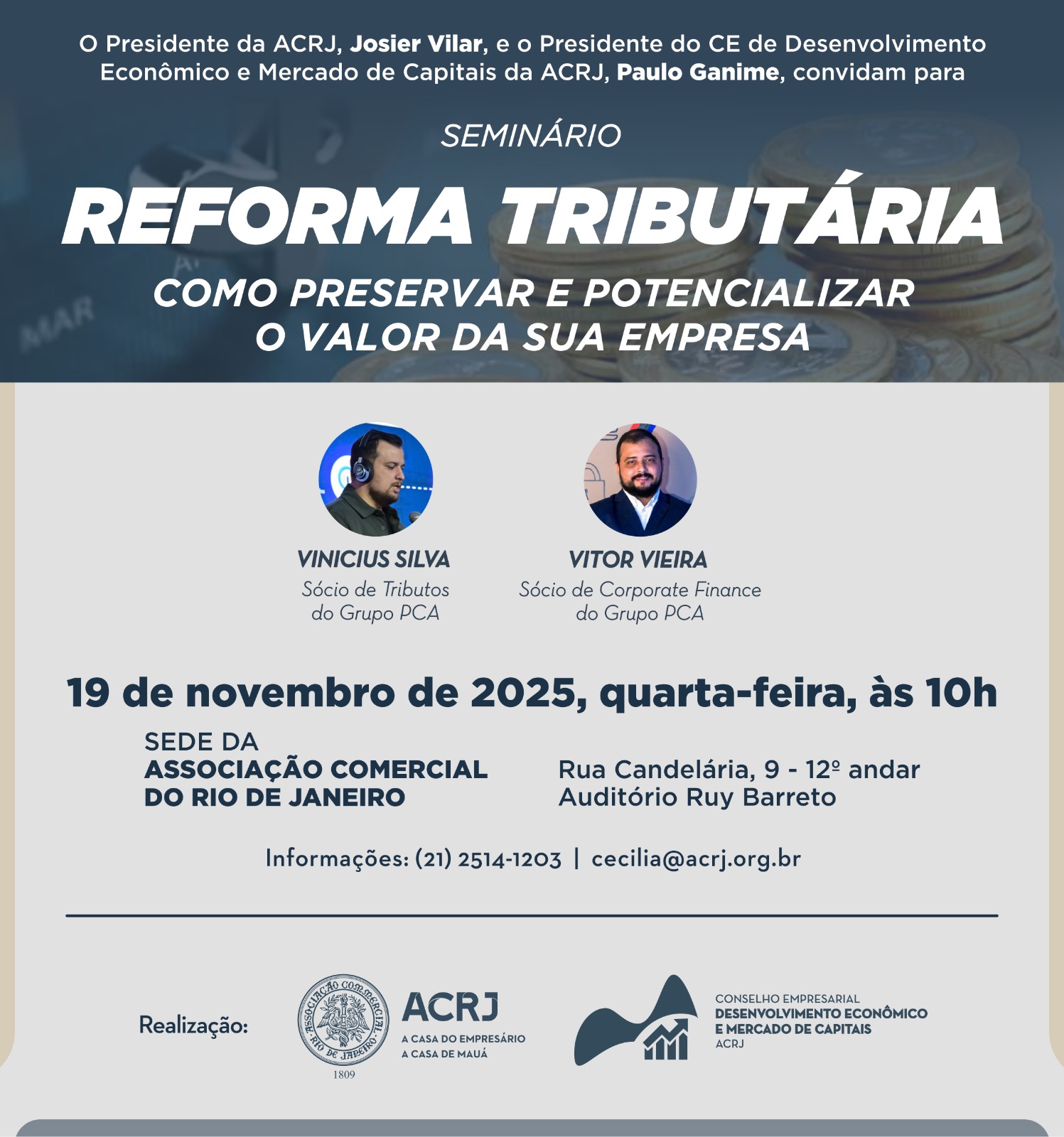 O Conselho Empresarial de Desenvolvimento Econômico e Mercado de Capitais da ACRJ promove, dia 19 de novembro, às 10h, o seminário “Reforma Tributária – como preservar e potencializar o valor da sua empresa”, com participações dos especialistas Vinicius Silva e Vitor Vieira do Grupo PCA.
