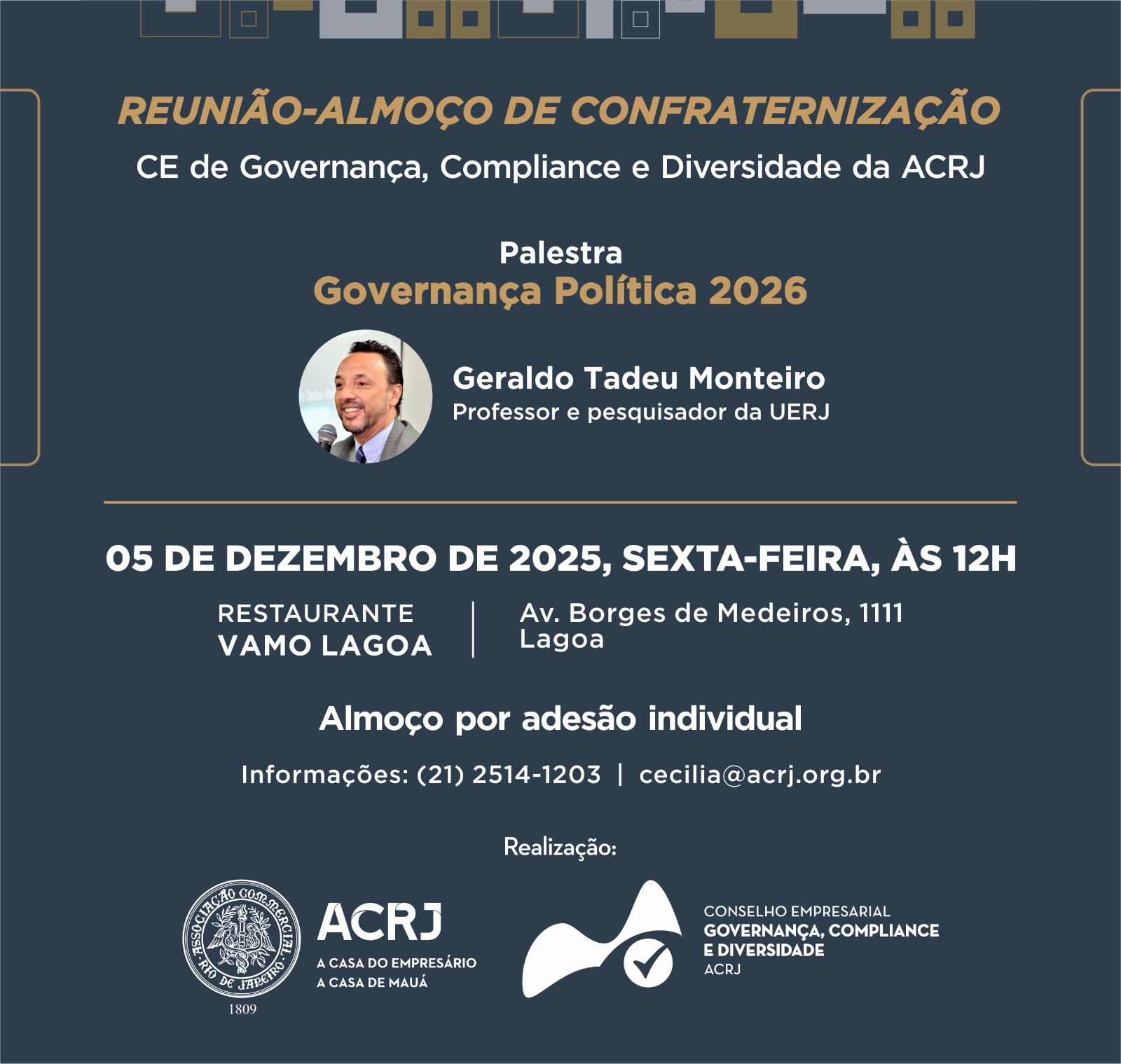 O Conselho Empresarial de Governança, Compliance e Diversidade da ACRJ encerra suas atividades do ano no dia 5 de dezembro, com a participação do professor e pesquisador da UERJ, Geraldo Tadeu Monteiro, que fará a palestra Governança Política 2026.