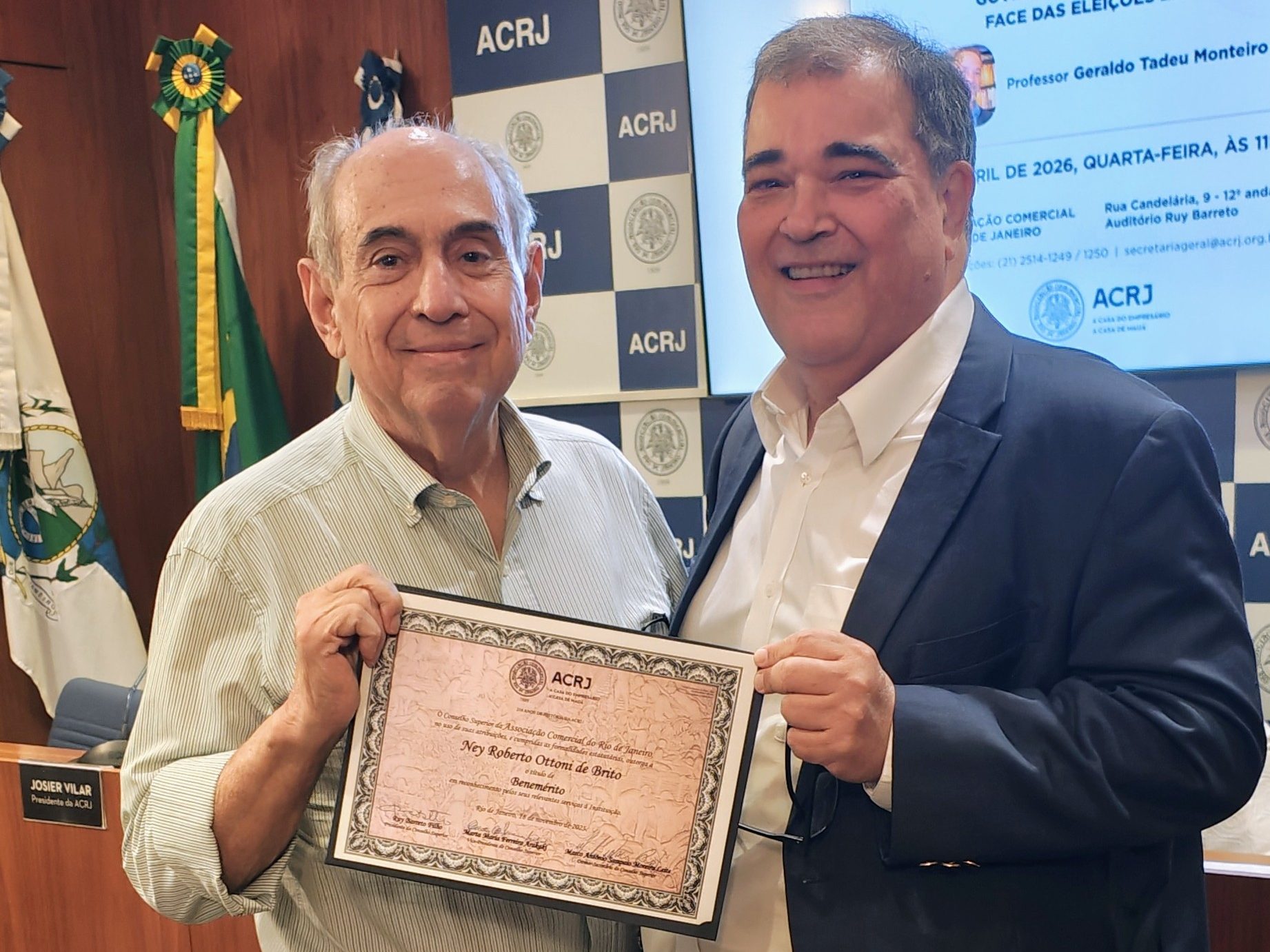 O Conselho Superior da ACRJ se reuniu, dia 15 de abril, sob a presidência de Ruy Barreto Filho, com a participação do presidente da ACRJ, Josier Vilar; do diretor-secretário do Conselho Superior, Marco Antonio Moreira Leite; e da vice-presidente, Marta Arakaki. Na pauta do encontro, a proposta de reforma estatutária, a entrega do diploma ao Benemérito eleito em novembro de 2025, Ney Roberto Ottoni de Brito e uma palestra do professor Geraldo Tadeu Monteiro.